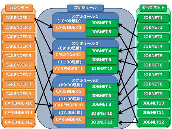 個々のオブジェクトを判りやすくするために、カレンダーとジョブネットを完全に独立して登録し、スケジュールにて組み合わせる方式をとっています。