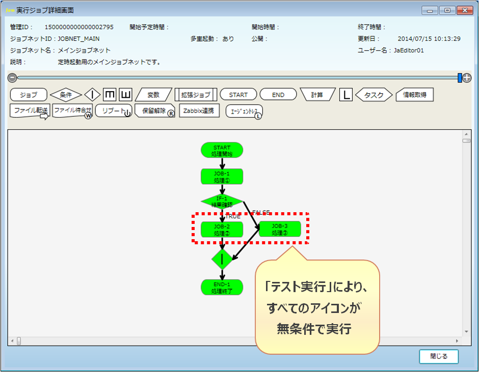テスト実行は、即座に処理を開始しますが、個々のジョブに登録されたコマンドの実行は行わず、ジョブフローの流れの正当性のみを検査します。