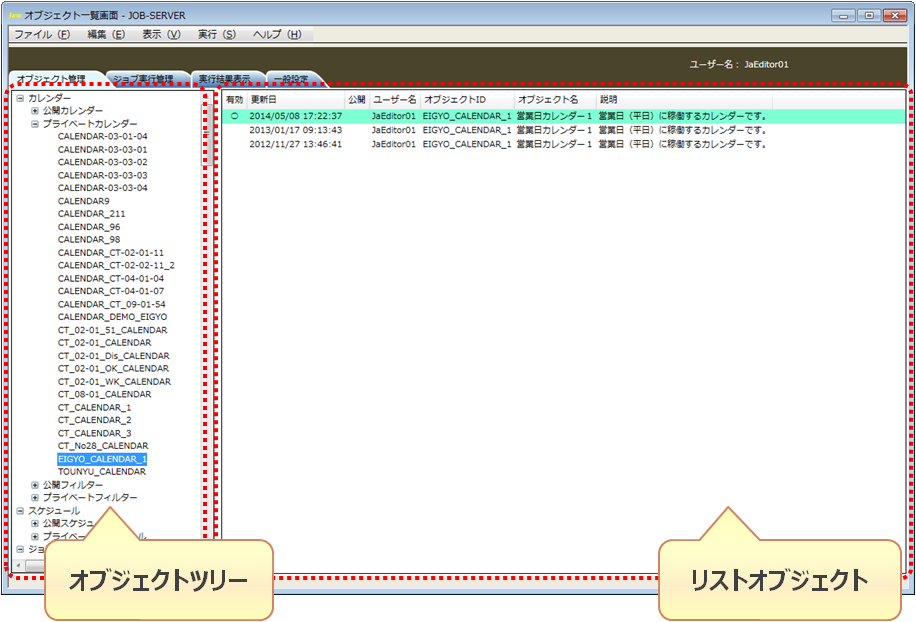 オブジェクト管理画面 オブジェクト管理画面は、登録、編集中のカレンダー、スケジュール、ジョブネットなど全てのオブジェクトの一覧を管理している画面です。 画面右側のリストオブジェクトは選択された個別オブジェクトをバージョン(更新日付)毎に表示をしています。 この画面にて、各オブジェクトに対して様々な操作をすることができます。 クリックで拡大