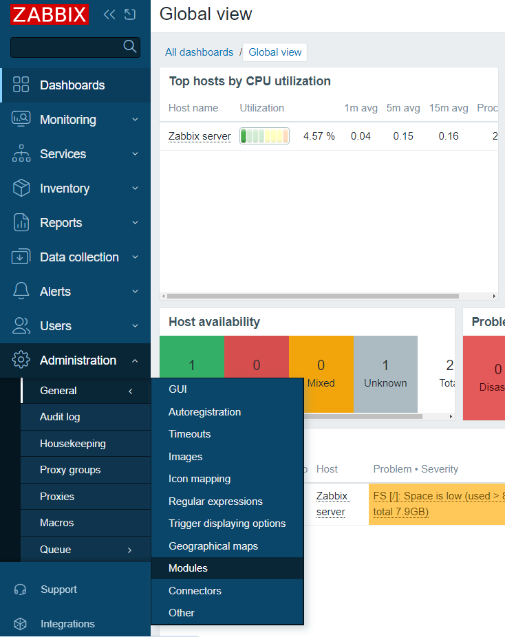 有効化されると、新しく追加された Jaz モジュールのメニューが Zabbix インターフェイスに表示されます。