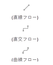 フローの種類には、アイコンを直線で接続する直線フロー、曲線で接続する曲線フロー、直角で接続する直交フローの3つがあります、処理の流れ(処理方向)が設定されます。